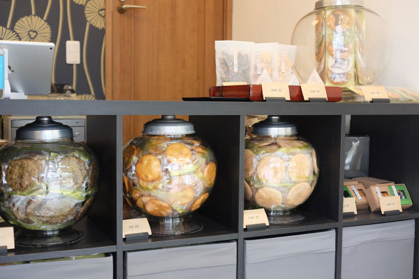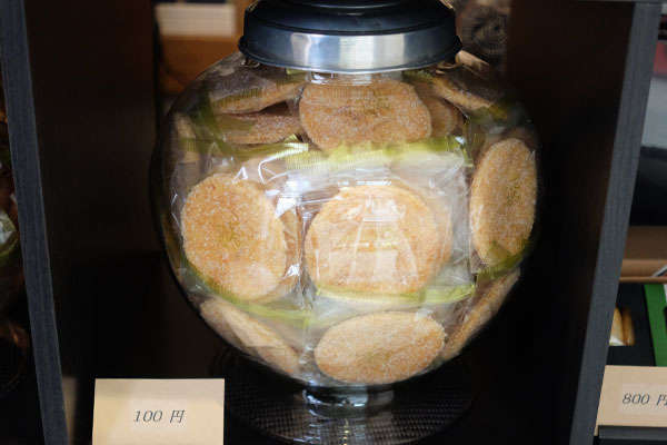 せんべいを入れている「地球瓶」と呼ばれるガラスの容器は、あられなどを量り売りしていた創業時に使っていたもの。住まい兼店舗を建て替えする際に整理していて見つかったものを、きれいに洗って再び使うことにしたそうです。