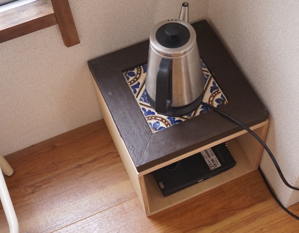 ポットさんも地べた生活から脱却。持っていたタイルの鍋敷きと全く同じサイズに作ってもらったのですが、見事にピタリのピタリ賞です。