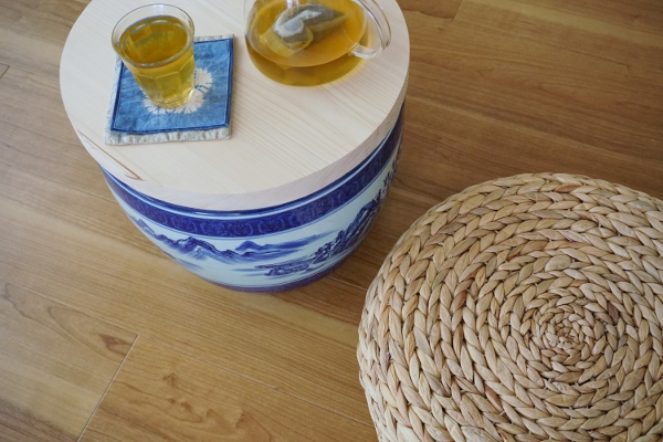 丸い板を、ニ〇リで買った安いウオーターヒヤシンスのスツールに置けば