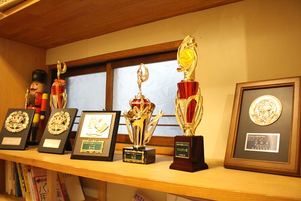 △スタジオ内には生徒たちがコンクールで賞をとった際のトロフィーがズラリ