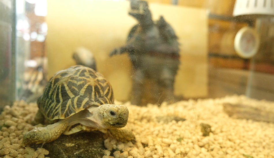 情報誌『ことみせ』9月号(H30/9/21発行)で看板ペットのいるお店を紹介する連載「もう1匹の店主」に登場の、インドホシガメ「2カメ」くん(♂推定20歳).