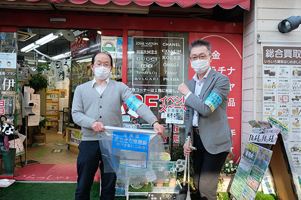 スタッフの皆さんや地域の方と一緒に月2回、開店前に「こうとうまち美化応援隊」として、店舗周辺のゴミ拾い活動で亀戸の美化を推進しています。