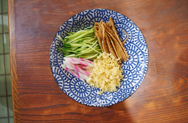 天かす、油揚げ、なると、キュウリと、「たぬき」と「きつね」の具材が両方乗っています。