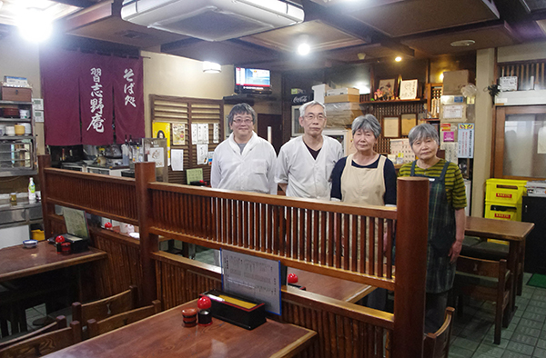 「いらっしゃいませ~」と気さくに迎えてくれたのは、2代目店主の吹野寿一さんと親族でもあるスタッフさん一同。家族で経営しているアットホームなおそば屋さんです。
