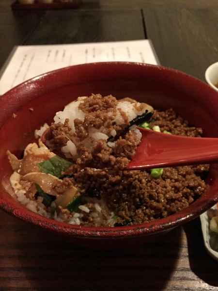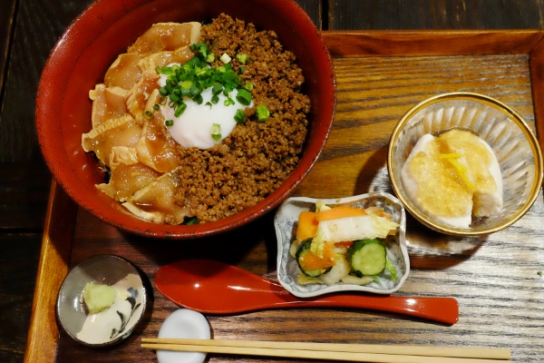 鶏肉のたたきと、夜のコース料理では定番の合鴨肉をそぼろにして丼ぶりに仕上げた、店主・石井一さんの創作料理「鳥わさと鴨そぼろの二色丼」(1,200円)です。
