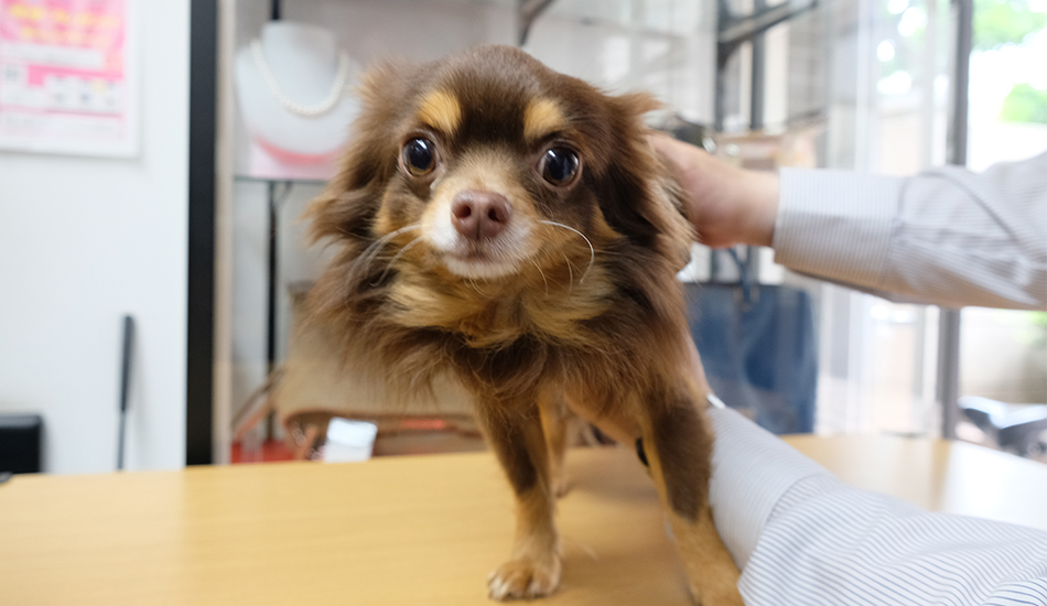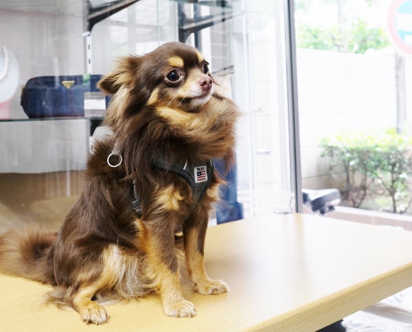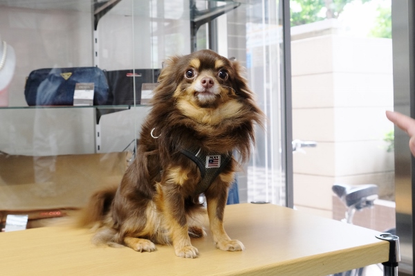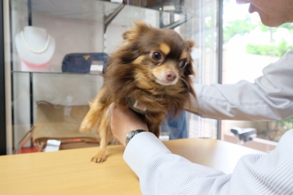 大島駅近、ブランド品や宝飾品などの買取専門店「買取本舗ジュエルブランド大島駅前店」にご主人と一緒に出勤するのは、ロングコートチワワのケンちゃん(♂6歳)。