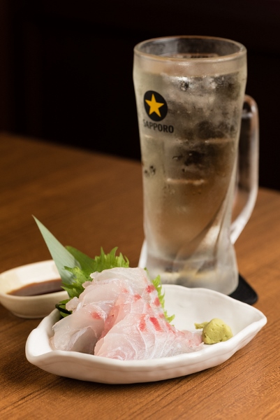 この日のサービス品はハイボール(250円)と真鯛刺身(350円)。