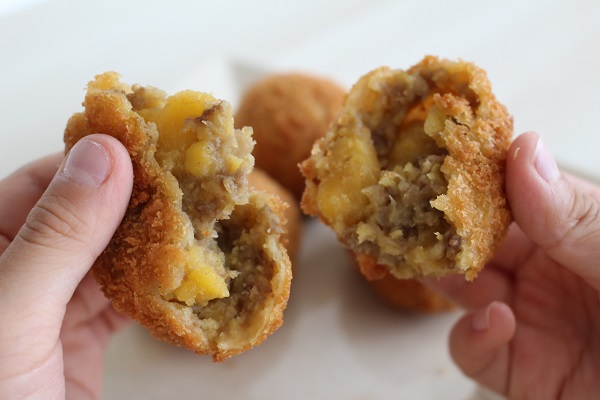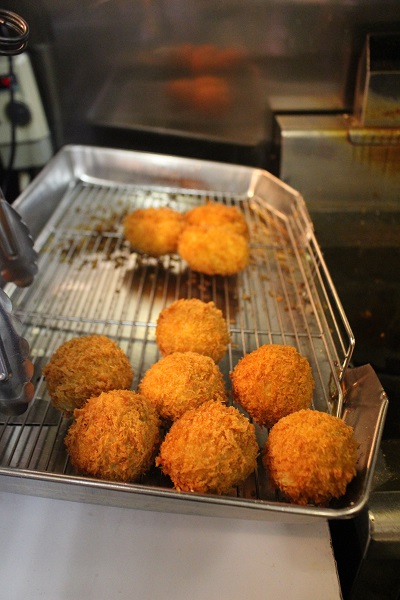 そして味のバランスを追求してたどり着いたのが真ん丸なボール型。衣少なめ&フィリングがしっかり味わえるこの形状がプレミアムコロッケの黄金フォルムなのです!
