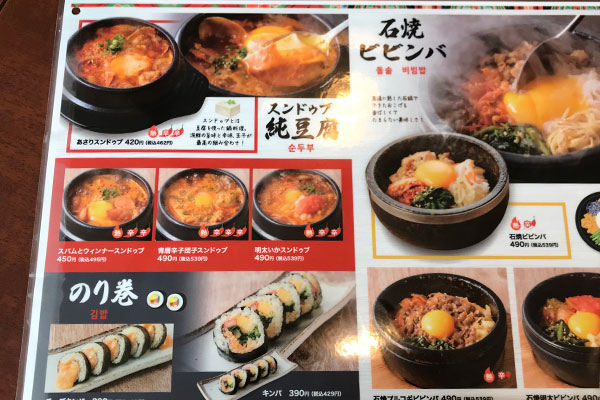 スンドゥブは、あさりの他にスパムとウインナー、青唐辛子団子、明太いかの3種類をラインナップ。お値段は495円から539円です。