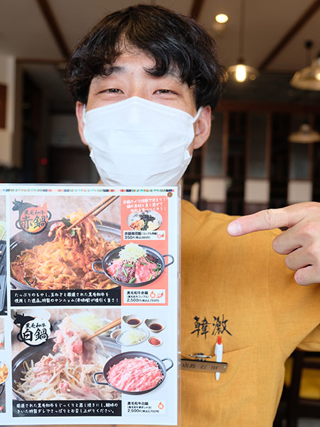 厳選した黒毛和牛とたっぷりのモヤシ、タマネギを使った韓激自慢の鍋料理2種。