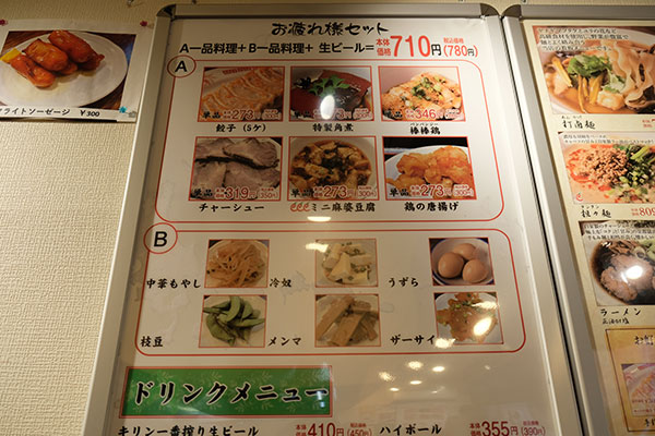 お好みの単品2種類とドリンクがセットで選べる「お疲れ様セット」780円は、ちょい飲みにぴったり!