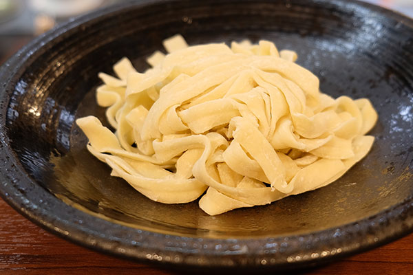 ちなみにこちらが、もちもちした食感と伸びにくいのが特徴の、刀削麺の生麺。つるつるっと食べられる細目のちぢれ麺と、人気は半々だそうです。