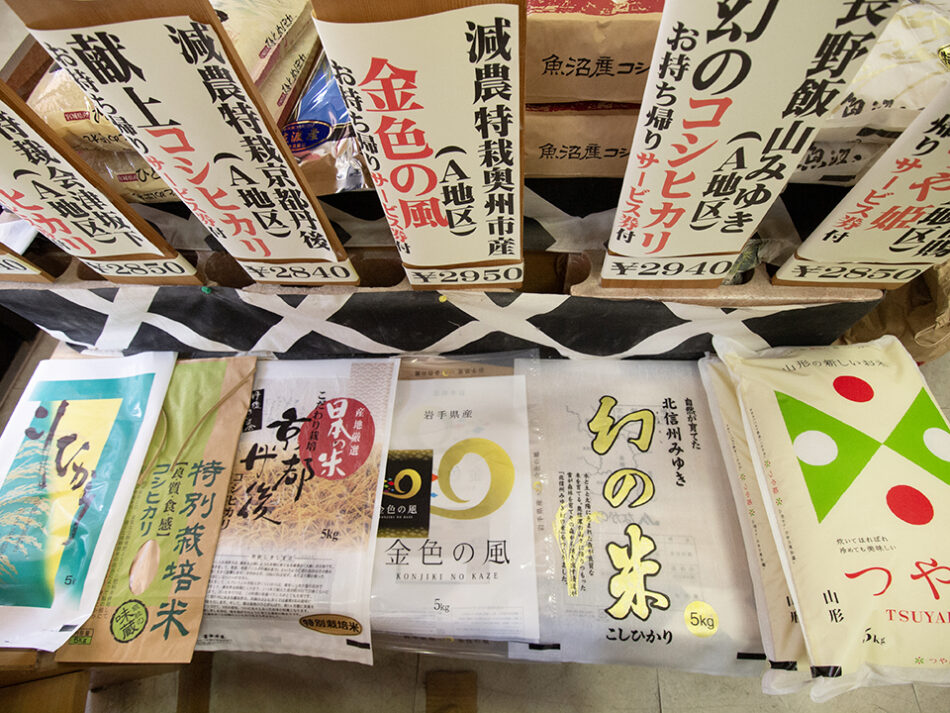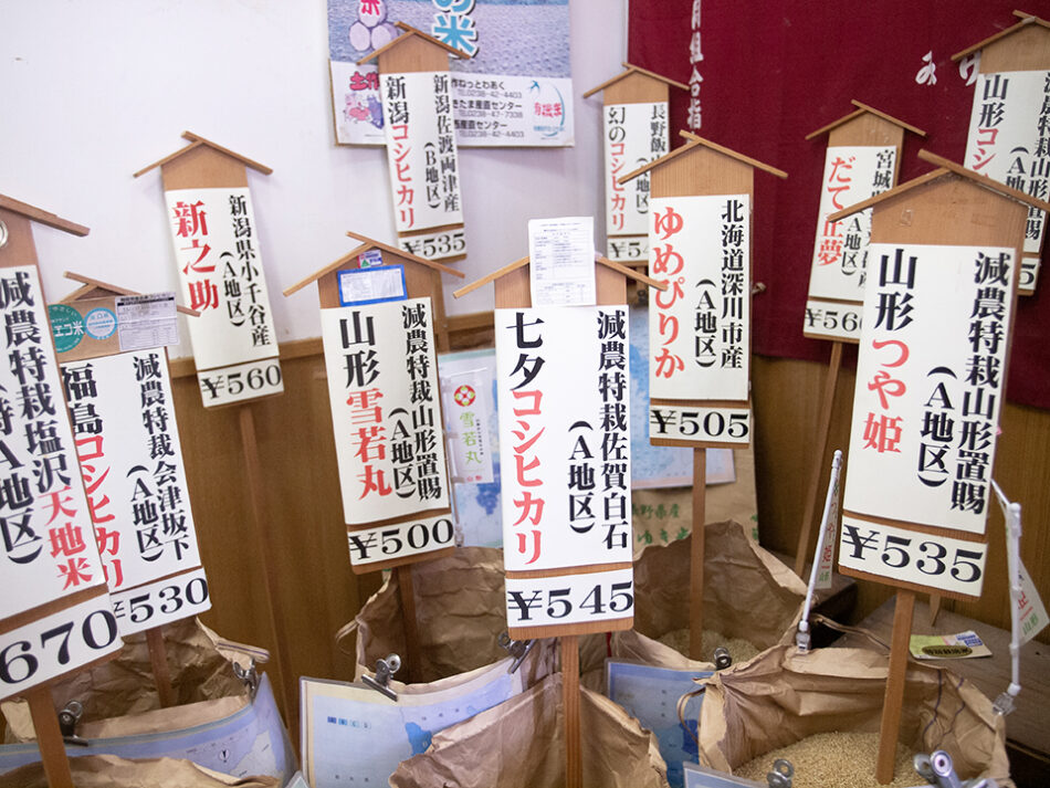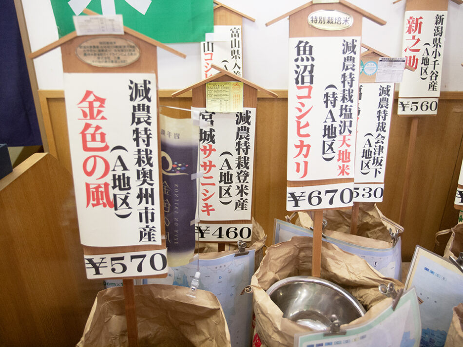 店で扱っている銘柄は現在17品種ほど。都内でも12軒でしか扱っていない奥州市産「金色の風」をはじめ、土壌の良さで高い評価を受ける特A地区で生産された魚沼産コシヒカリ「天地米」(地内での取り扱いは15店舗程度)など、お米専門店以外ではあまり取り扱っていないラインナップが中心です。