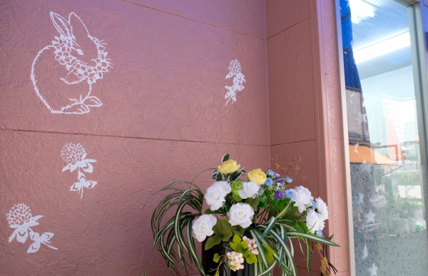 外壁や店入口にある安藤さんの切り絵をモチーフにしたかわいらしいステンシルが目印です。