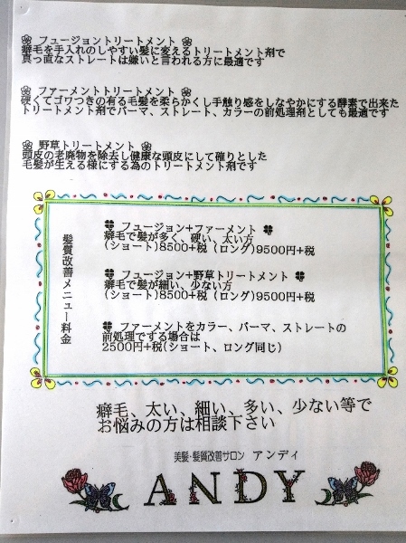 フュージョン、ファーメント、野草と3種類のトリートメントを使った髪質改善メニューで美髪に導くとのこと。メニューはこちら。髪質によって選べます。
