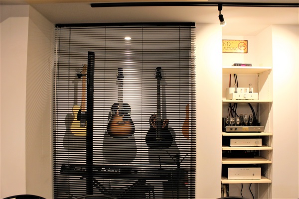 △店の一角には”見せる収納”の楽器倉庫も。今後は様々なライブも行う予定だそう