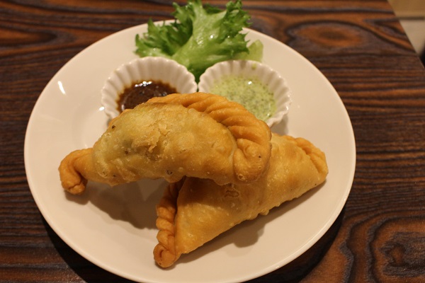 こちらは自家製のサクサク生地に具材をたっぷり詰めて揚げる「サモサ」500円。甘酸っぱいタマリンドチャツネとグリーンチャツネを添えて。いずれも秋元さんが大切にしているレシピによる自家製です。
