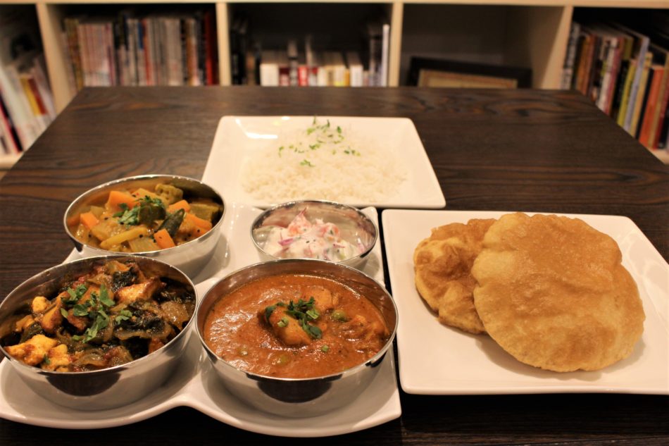 今回ご用意いただいたのは「バターチキン」「ほうれん草とパニールのカレー」「にんじんと大根のサンバル」の3種のカレーにライスか自家製プーリー、マサラサラダorライタサラダが付く「Bセット」1,150円。
