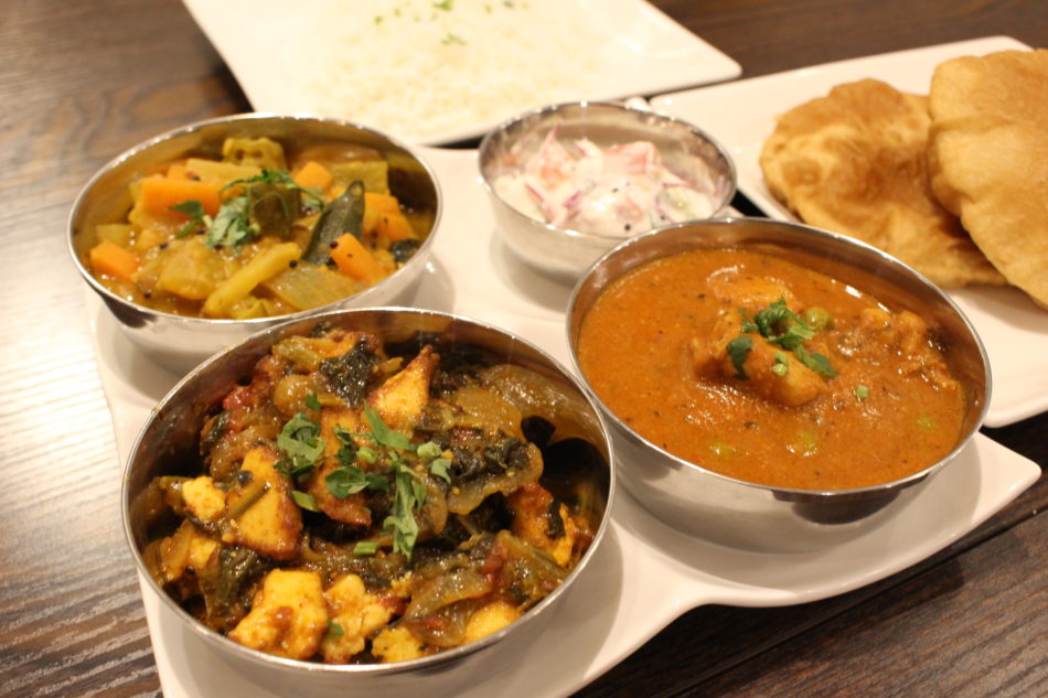△手前から時計回りに「ほうれん草と自家製パニールのカレー」、「サンバル」「バターチキン」