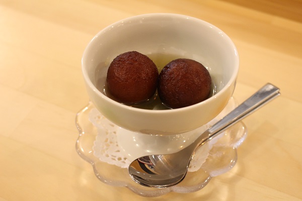 そして、忘れてならないのが、自家製スイーツ! こちらは世界一甘い(?)スイーツともいわれる「グラブジャムン」300円。小麦粉と砂糖、ミルクを合わせた生地を丸く成型して油で揚げ、シロップに漬けたインドのお菓子ですが、秋元さんはシロップの甘さを調整し、カルダモンなどのスパイスをアクセントに加え、日本人にも食べやすい一品に。