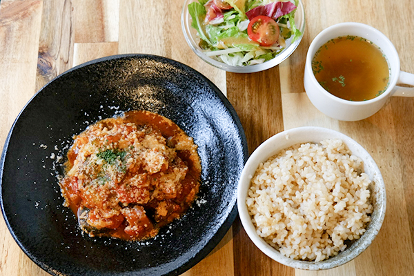 こちらは、「自家製和牛入りハンバーグ」。スパイスがきいたオリジナルハンバーグに玄米ごはんとスープ、サラダがセットで1,100円(税込)。