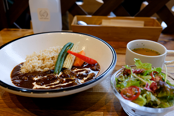 こちらの料理はランチタイムで提供する、スープとサラダがセットになった「3種ビーフのハヤシライス」980円(税込)。ごはんは玄米を使っています。