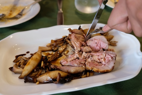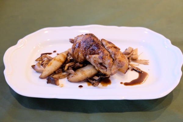 うずらから取った出汁、バルサミコソース、赤ワインなどで作った特製ソースがこれまたおいしい! キノコ、旬の果物のソテー(この日は梨でした)と一緒に絡めていただきました。