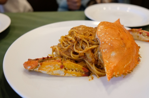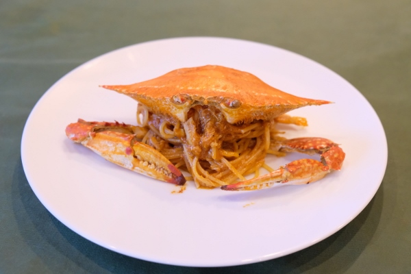 やわらかい甘みが特徴のメスのワタリガニをまるごと1匹使った、この店の定番料理です。