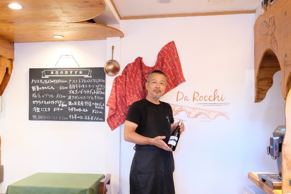 イタリア料理とワインが大好きというオーナーシェフ・石﨑博さん。料理修行のため2年間暮らした、イタリアの町の近くにあった橋が、店のロゴになっています。