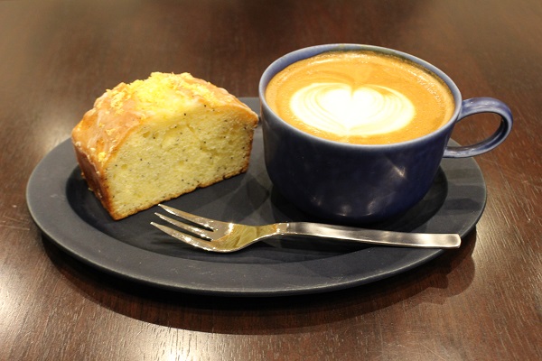 △1本にレモン1.5個分の果汁と皮を使った「レモンポピーケーキ」450円、「カフェラテ」580円
