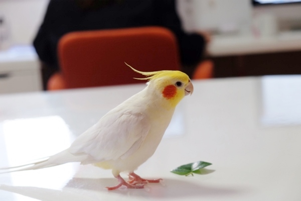 オフィスをこの場所に移転した時、「飛翔」とか「進展する」という縁起物として知人からプレゼントされたというオカメインコです。