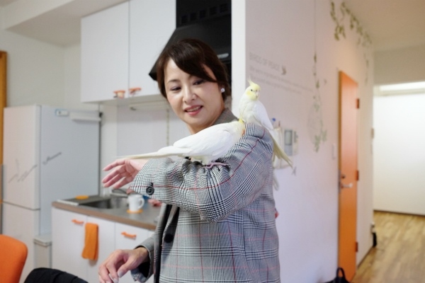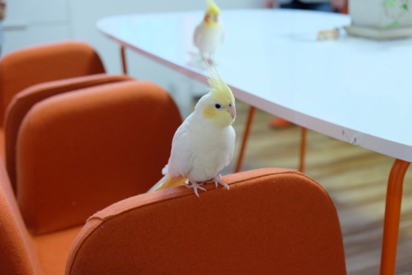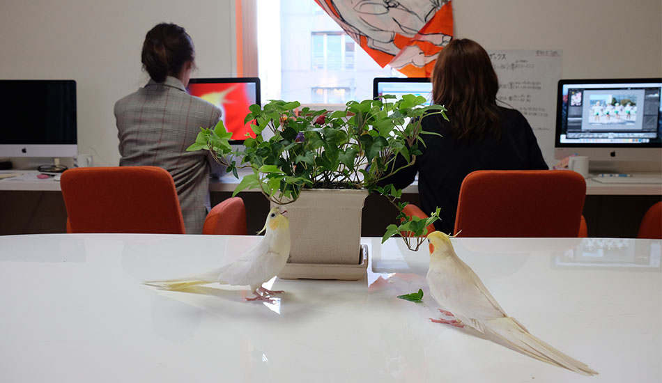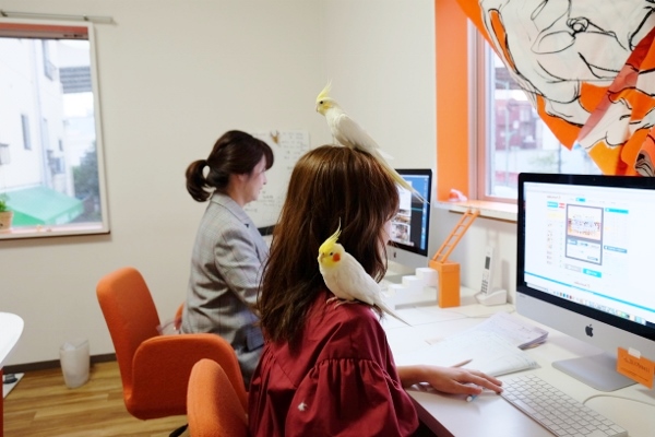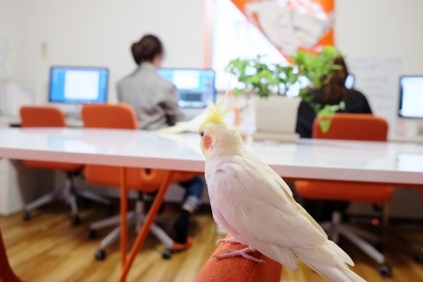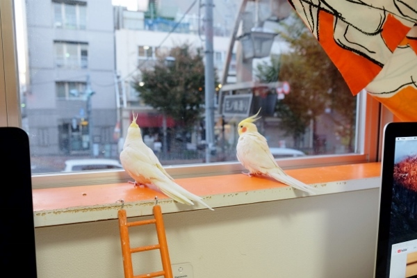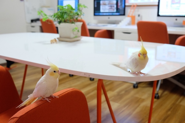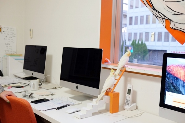 「それまで、鳥はあまり好きじゃなかったの」という、オーナーでデザイナーの仁科里海さん。ポチくんと暮らし、一緒に通勤するうちに「オカメインコって、ほんとに可愛い!」と、1年後にもう1羽、ポチくんの部下として採用したのがちょんまげくんです。