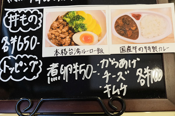 「定番の丼物も人気です」と店長。「本格台湾ルーロー飯」と「国産牛の特製カレー」でどちらも650円。お好みでトッピングも。