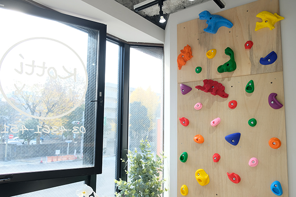店内には、パパやママが施術中のお子さんが、漫画を読んだり、自由にボルダリングができるクライミングウォールを設置したキッズスペースもありました。