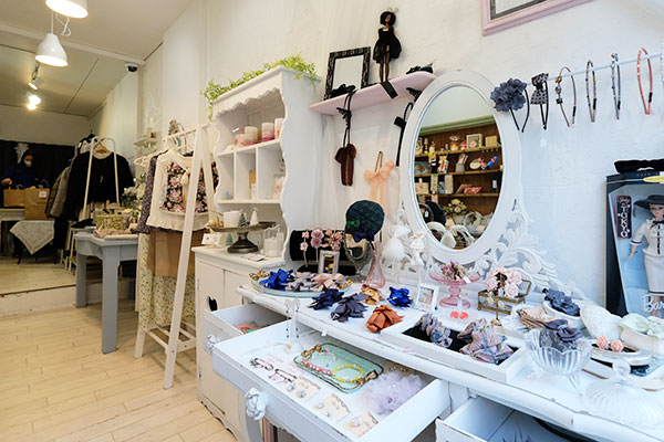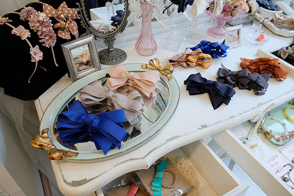 ヘアアクセサリー作家さんが作るリボンを使ったヘアアクセサリーは、この店の看板商品のひとつ。上品な色使いとデザインは、この作家さんならでは。