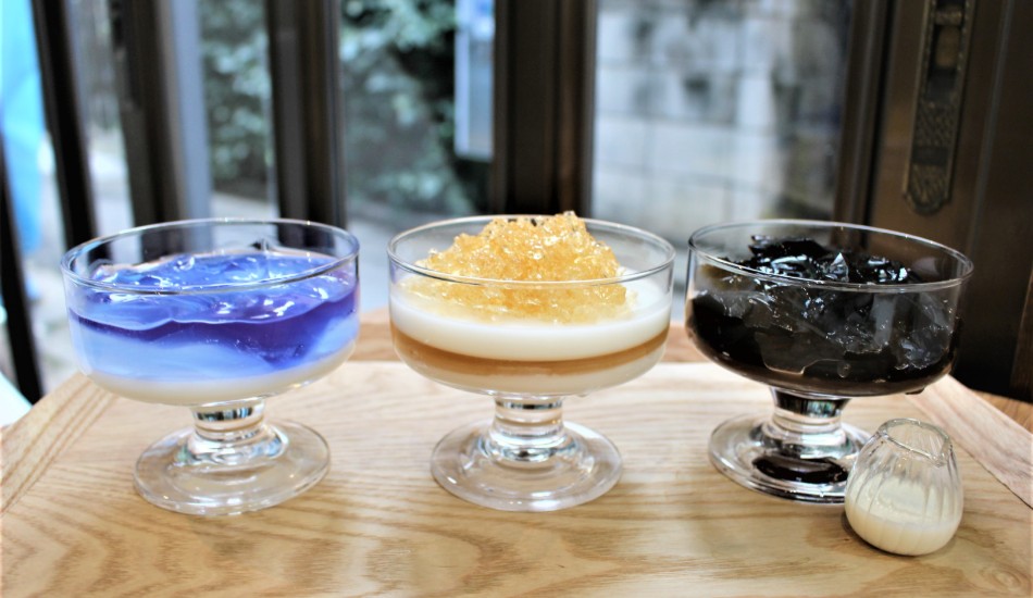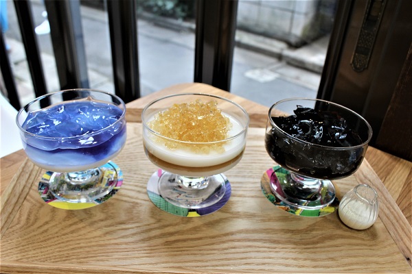 左は、一番人気の「清澄BLUE」。美しいブルーのバタフライピー&レモングラスのゼリーは甘酸っぱくてトロトロ、下のミルクゼリーは甘くてミルキーなぷるぷる食感。中央の「白河WHITE」は、ジャスミンゼリーとココナッツゼリーの組み合わせが絶妙の、香り高いおいしさ。右の「NO MARK BLACK」は、ビターなコーヒーゼリーともっちり甘い餡ゼリーが好相性。いずれも甘さ控えめの優しい味わいです。
