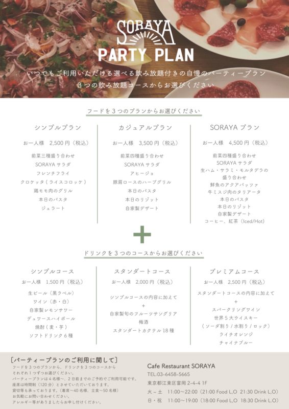 友人や家族と集まる機会の多いこのシーズン、4名以上ならパーティプランと飲み放題プランもおすすめです。各3種ずつあり、それぞれお好みのものを組み合わせてカスタマイズOK!