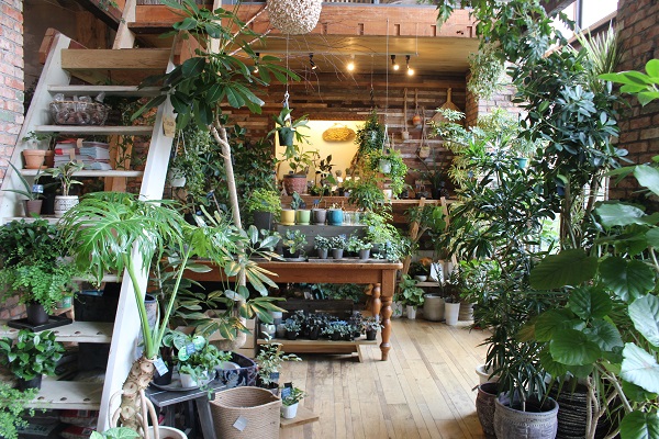 店内には太陽光降り注ぐ5.3mもの吹き抜けが配され、ハンギングプランターが緑の影を落としています。