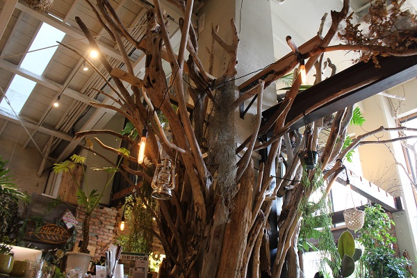 テーブルやランプにもグリーンが散りばめられ、クラフト感あふれる壁にはダイナミックなドライフラワーが。これらを手掛けるのは入居するグリーンショップ「MICAN」さん。シーズナルなデコレーションで、店内を様々なテイストに彩っています。