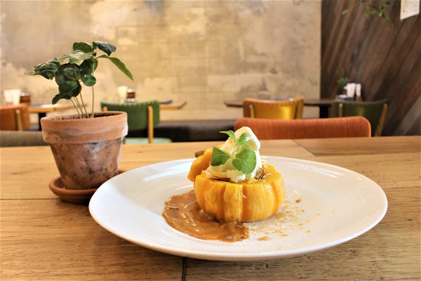 中にはバニラアイスに生クリーム、果肉やパイ生地などのおいしい層がぎっしり。濃厚な自家製キャラメルソースとこっくりとしたかぼちゃがよく合います。