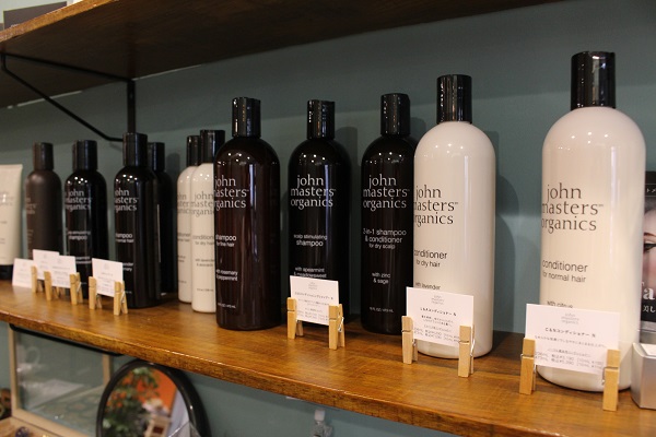 使用するヘアケア製品は小関さんが吟味したこだわりの商材。まずシャンプーなどの基本的なヘアケアラインはアメリカ発のオーガニックシリーズ。