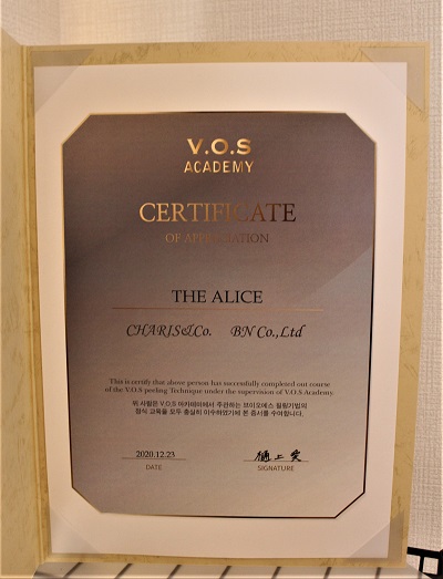こちらはVSOのサーティフィケート。小関さんは区内ではまだ少ない、VOS認定エステティシャンなのです。