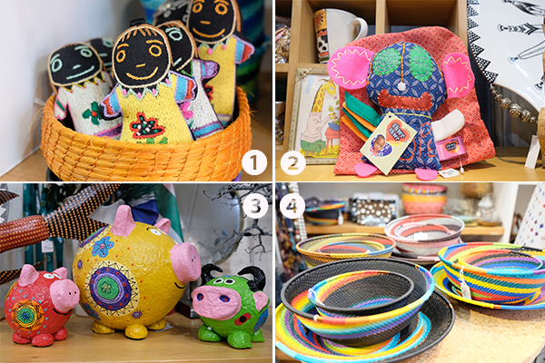 ①南アフリカの民族人形(1,650円)②南アフリカの伝統的な生地を使って、子どもが描いた絵をモチーフに作るシュエシュエポッピ人形(3,300円)③鮮やかな配色がインテリアのアクセントになる、張り子の貯金箱(大4,500円、小2,700円)⑤もともとは電話線を編んでいたという職人による、硬くて丈夫な手編みのワイヤーバスケット(2,200円~)