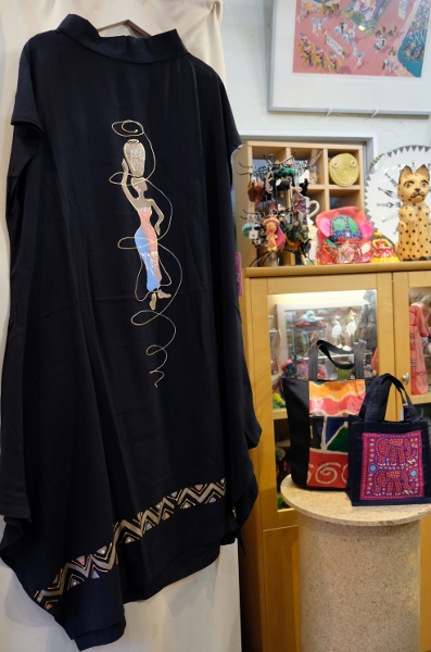 こちらの黒い服は、南アフリカのデザイナーによる手描きのドレス(19,000円)。アフリカの民族や文化をテーマにした絵柄で、Tsotangの直輸入品。