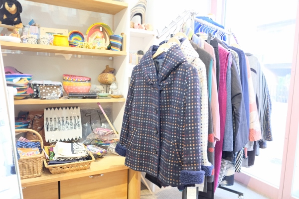 雑貨だけでなく服も、色使いやデザインが個性的でおしゃれな1点ものがほとんど。