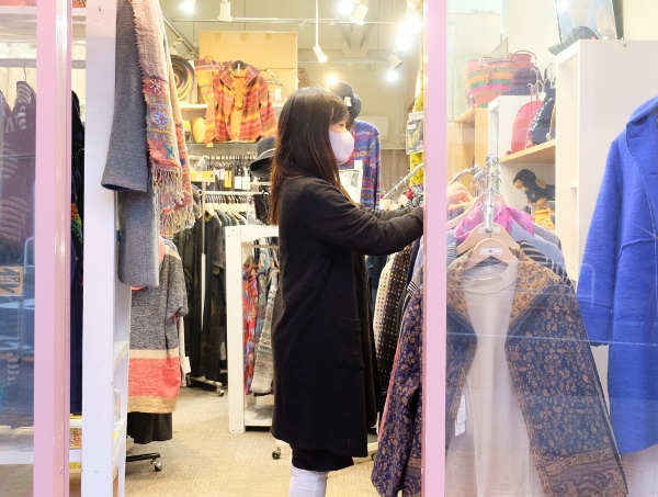「夏はインド綿など、天然素材を使った着心地の良い服を揃えています。タイ製の生地を使った服も多いです。冬のコートはイタリア製が多いですね。量産品ではないものをセレクトしています。カラフルで個性的な、気分が上がるお洋服ばかりですよ」と三原さん。